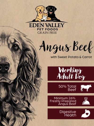 Beef 50% (including Freshly Prepared Angus Beef 28%, Dried Beef 19% & Beef Fat 3%), Sweet Potato (26%), Potato, Peas (7.5%), Linseed, Beet Pulp, Minerals, Omega 3 Supplement, Carrot (0.1%), Fructooligosaccharides (FOS, 96 mg/kg), Mannanoligosaccharides (MOS, 24 mg/kg