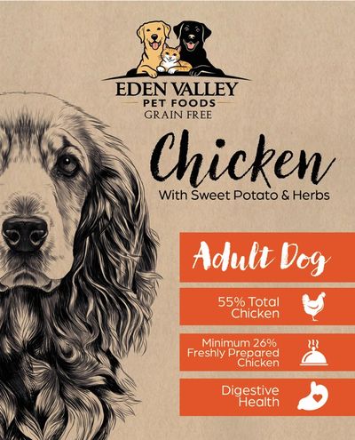 Chicken 55% (including Freshly Prepared Chicken 31% & Dried Chicken 21% & Chicken Stock 3%), Sweet Potato (26%), Peas (6%) Potato,Beet Pulp, Linseed, Omega 3,Minerals, Herbs, MOS & FOS