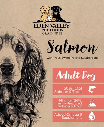 Salmon & Trout 50% (including Freshly Prepared Salmon & Trout 36% , Dried Salmon 12%, Salmon Stock 2%), Sweet Potato 24%, Peas (9%) Potato,,Beet Pulp, Linseed, Omega 3,Minerals, Asparagus, MOS & FOS