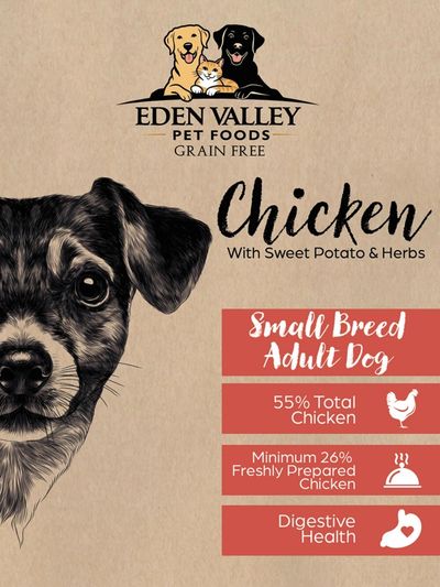 Chicken 55% (including Freshly Prepared Chicken 27%, Dried Chicken 26% & Chicken Stock 2%), Sweet Potato (26%), Peas (7%), Beet Pulp, Potato, Linseed, Omega 3 Supplement, Minerals, Herbs (0.3% including Marjoram, Basil, Oregano, Sage, Thyme, Parsley), Fructooligosaccharides (FOS, 96 mg/kg), Mannanoligosaccharides (MOS, 24 mg/kg)