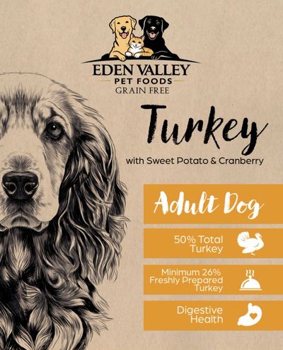 Turkey 50% (including Freshly Prepared Turkey 28% , Dried Turkey 20%, Turkey Stock 2%), Sweet Potato 26%, Peas (9%) Potato,Pea Protein,Beet Pulp, Linseed, Omega 3,Minerals, Cranberry, MOS & FOS