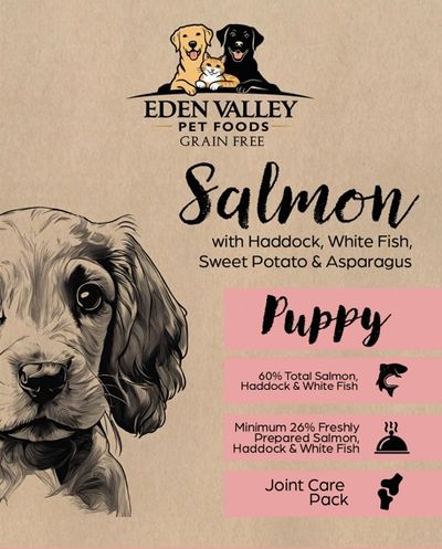 Salmon, Haddock & Whitefish 60% (Freshley prepared Salmon 21% Dried Salmon 16%, freshley prepared Haddock 11%, freshley prepared whitefish 10% and Salmon stock 2%) Sweet Potato 20%, Potato, Beet Pulp, Peas (6%), Linseed, Omega 3 supplement, minerals,Asparagus (0.1%) Glucosomine, Chondroitin, FOS & MOS