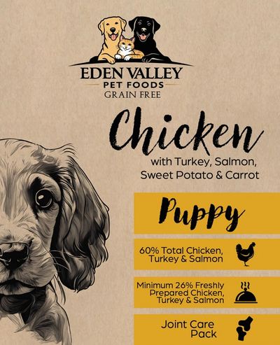 Chicken, Turkey & Salmon 60% (including Freshley Prepared Chicken 20%, Dried Chicken 14%, Freshly prepared Turkey 7% Freshley Prepared Salmon 7% Dried Salmon 3% & Chicken Stock 2%), Sweet Potato (22%), Potato, Beet Pulp, Linseed, Minerals, Carrot, Peas, Omega 3, MOS, FOS, Glucosomine, Chondroitin.