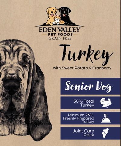 Turkey 50% (including Freshly Prepared Turkey 27%, Dried Turkey 21% & Turkey Stock 2%), Sweet Potato (16%), Potato, Peas (8%), Beet Pulp, Linseed, Omega 3 Supplement, Minerals, Cranberry (0.2%), Glucosamine (170 mg/kg), Methylsulfonylmethane (170mg/kg), Chondroitin Sulphate (125 mg/kg), Fructooligosaccharides (FOS, 96 mg/kg), Mannanoligosaccharides (MOS, 24 mg/kg)